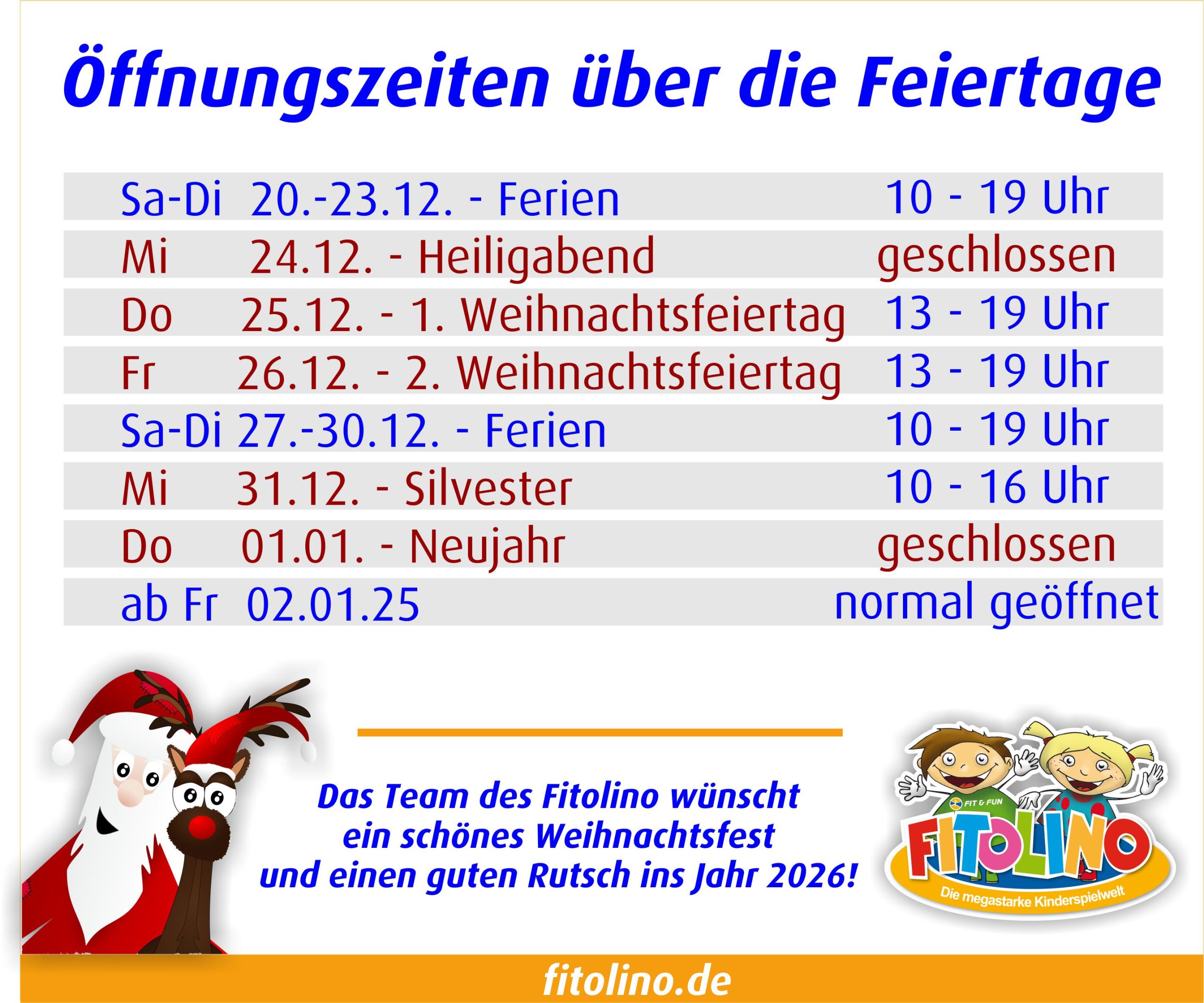 Das Fitolino hat auch in den Weihnachtsferien für Euch geöffnet! Bitte die Öffnungszeiten über die Feiertage beachten!