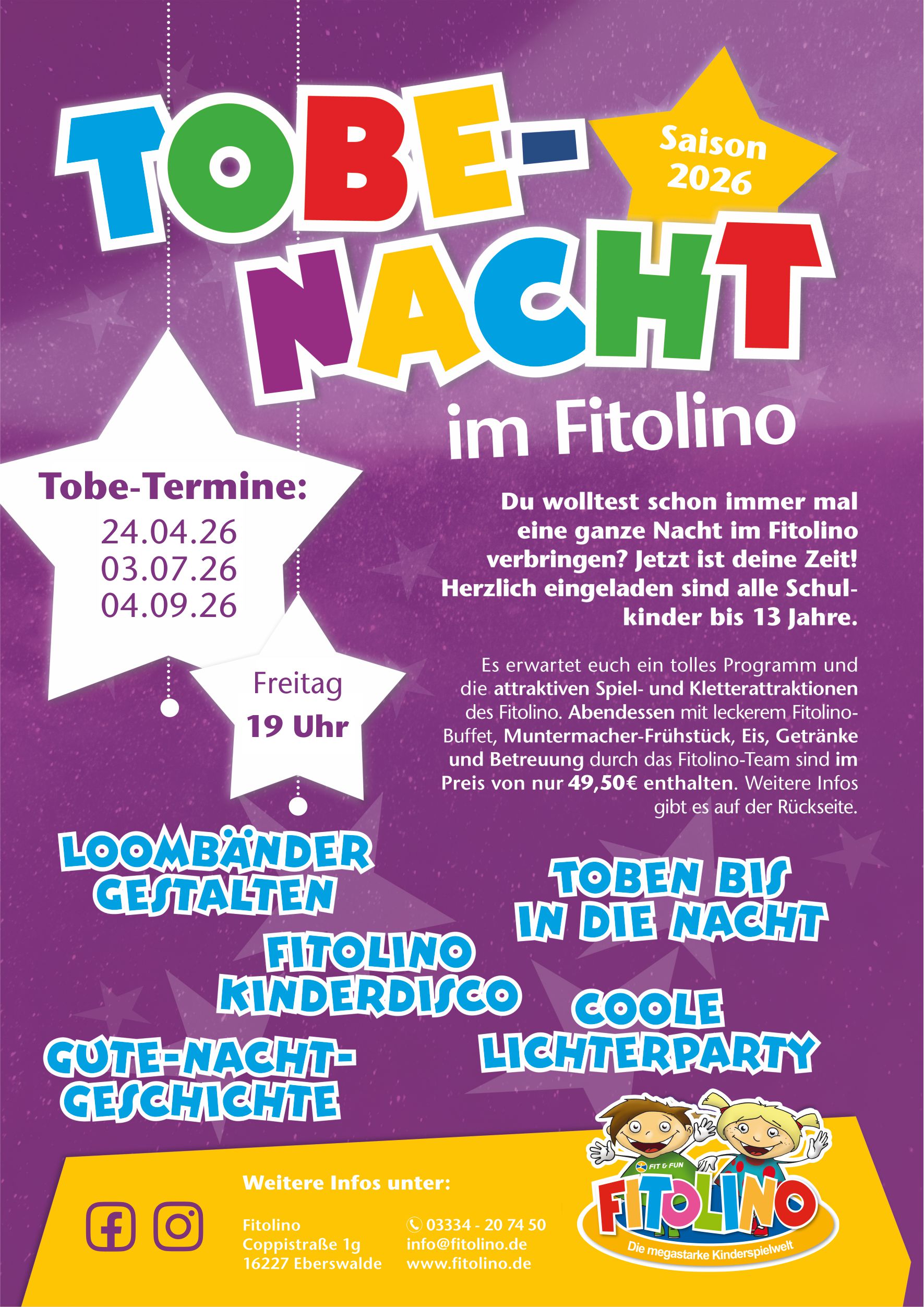 Neben den attraktiven Spiel- und Kletterattraktionen des Fitolino erwartet alle Kinder ein tolles Programm mit cooler Lichterparty, Fitolino Kinderdisco, Loombänder gestalten und natürlich Toben bis in die Nacht!